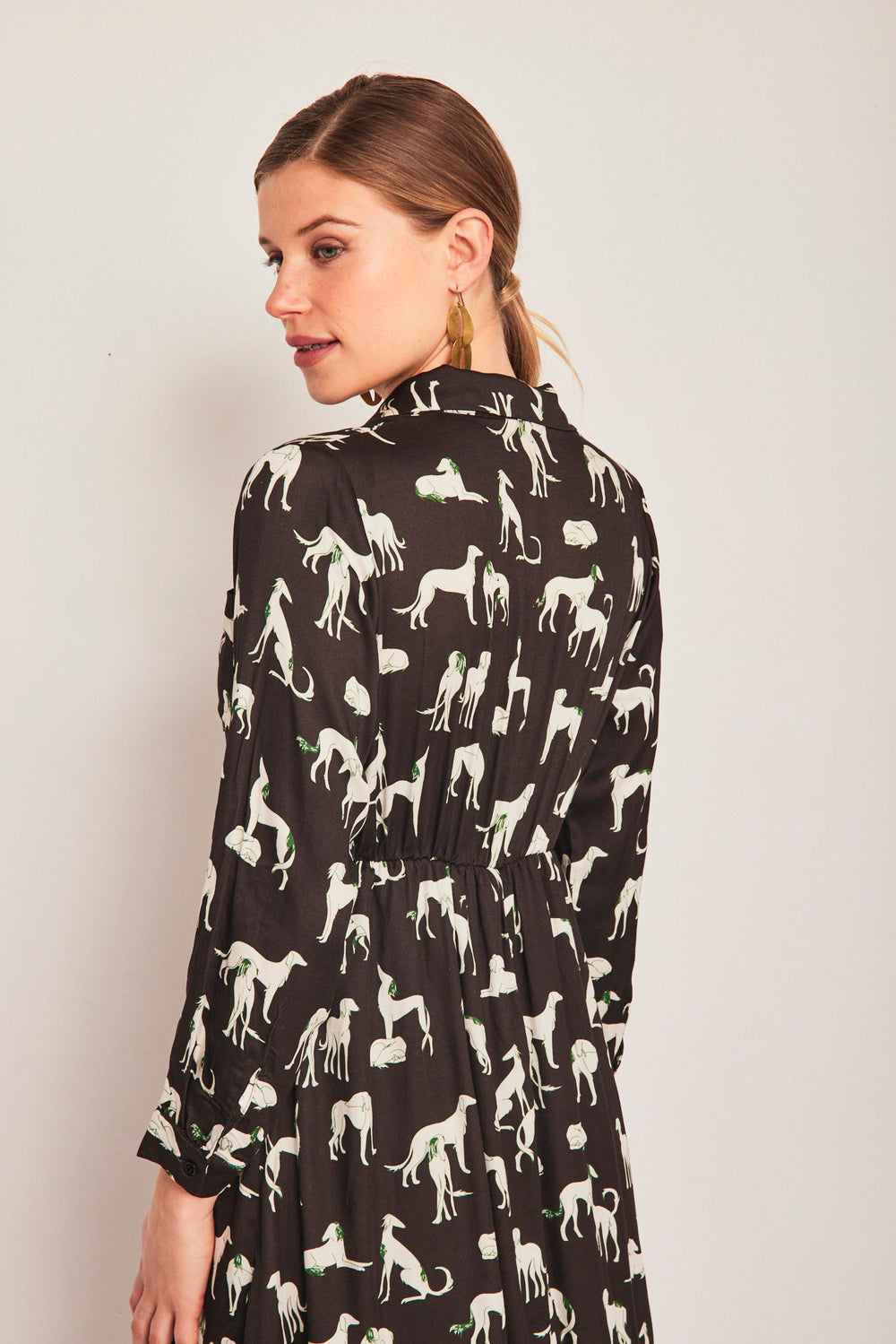 Vestido camisero corte midi con elástico en la parte trasera y bolsillos, lleva forro.